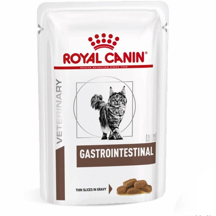 پوچ گربه رویال کنین مدل گاسترواینتستینال یک غذای مرطوب درمانی است که مخصوص گربه هایی که از مشکلات گوارشی از جمله اسهال و بیماری های التهابی روده رنج می برند ، تهیه شده است. گاسترواینتستینال غذایی مطبوع و با انرژی بالا است، به این معنی که منجر به کاهش حجم کار روده می شود.